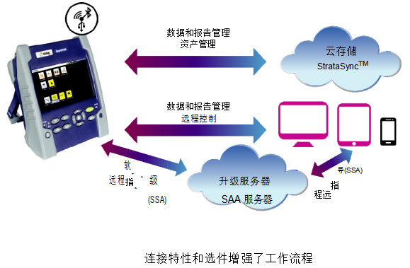 多個(gè)連接選件(通過(guò)USB和可選的藍(lán)牙/WiFi進(jìn)行3G/4G智能手機(jī)連接)可實(shí)現(xiàn)遠(yuǎn)程控制,并可與平板電腦、智能手機(jī)和計(jì)算機(jī)來(lái)往傳輸數(shù)據(jù)及工作指令。SmartOTDR可實(shí)時(shí)快速解決現(xiàn)場(chǎng)問(wèn)題,可選的SmartAccess Anywhere(SAA)可在云中開(kāi)辟一條隧道,使技術(shù)人員能夠遠(yuǎn)程訪(fǎng)問(wèn)和操作儀器。SmartOTDR與各種各樣的云服務(wù)器(WebDAV服務(wù)提供商)兼容,還可使用自帶的FastReport.pdf報(bào)告生成功能即時(shí)共享測(cè)量報(bào)告。